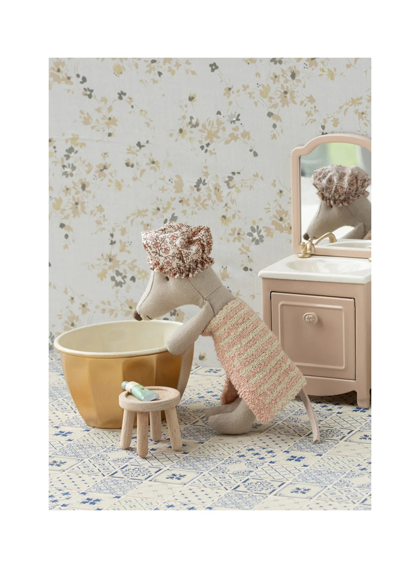 Plongez dans l’univers charmant de Maileg avec cette adorable souris et son set de bain. Livrée avec une baignoire dorée, une serviette moelleuse et un bonnet de douche, cette petite souris adore se prélasser dans un bain chaud, comme un vrai moment de spa. Ce jouet enchanteur invite les enfants à créer des histoires remplies de douceur et de relaxation.